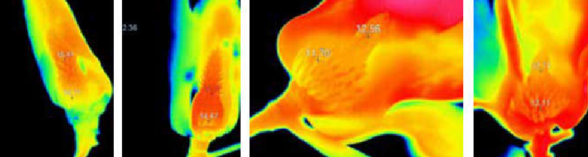适宜的温湿度对于植物的生长繁殖和花粉的发育、传播、柱头授粉、花粉管生长、种子发育等过程有着重要的作用。 为了最大限度的提高培养的成功率,研究花朵内部温度分布情况有助于更好了解植物生长发育特性。 例如,使用红外热像仪拍摄并记录玉兰花花期过程,不同时期花芽的温度分布,对研究玉兰花开花过程中花朵自热过程有着重要意义。 花蕊中雌蕊和雄蕊的粗细在1mm左右,检测目标极小,使用红外热像仪则可以清晰显示雌蕊和雄蕊的形态。 另外为了减少刚摘下的花朵自身热量快速流失,需要在极短完成调焦和拍摄,红外热像仪快速拍摄的功能完美解决了这一问题。